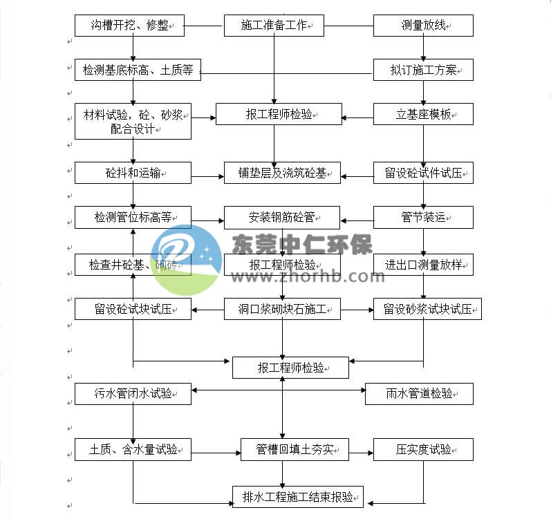 一、目的 雨污分流,是一種排水體制,是指將雨水和污水分開(kāi),各用一條管道輸送,進(jìn)行排放或后續(xù)處理的排污方式。用于被污染的河流。雨污分流便于雨水收集利用和集中管理排放,降低水量對(duì)污水處理廠的沖擊,保證污水處理廠的處理效率。 二、相關(guān)標(biāo)準(zhǔn) 1、《室外排水設(shè)計(jì)規(guī)范》(GB50014-2006) 2、《給水排水管道工程施工及驗(yàn)收規(guī)范》(GB50268-97) 3、《給水排水工程管道結(jié)構(gòu)設(shè)計(jì)規(guī)范》(GB50332-2002) 4、《混凝土結(jié)構(gòu)設(shè)計(jì)規(guī)范》(GB50010-2002) 5、《給水排水工程構(gòu)造物結(jié)構(gòu)設(shè)計(jì)規(guī)范》(GB50069-2002) 6、《中華人民共和國(guó)工程建設(shè)標(biāo)準(zhǔn)強(qiáng)制條文》(城市建設(shè)部分) 7、《混凝土結(jié)構(gòu)工程施工質(zhì)量驗(yàn)收規(guī)范》(GB50204-2002) 8、《市政排水灌渠工程質(zhì)量檢驗(yàn)標(biāo)準(zhǔn)》(CJJ-90) 三、施工工藝: 1、溝槽開(kāi)挖 2、墊層及平基(基層)施工 3、下管 4、安管 5、管座 6、抹帶、橡膠圈接口,檢查 7、檢查井、雨水口砌筑 8、回填土 UPVC管道施工 1、管材及配件 2、管道鋪設(shè) 3、閉水試驗(yàn) 四、施工流程簡(jiǎn)圖 溝槽、管材檢驗(yàn)合格→下管→對(duì)口連接→部分回填→閉水試驗(yàn)合格→全部回填