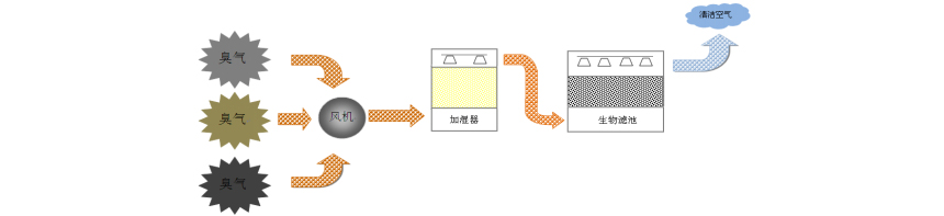惡臭廢氣→風機→加濕器→生物除臭設備→高空排放