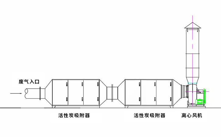 印刷廢氣氣體由風(fēng)機(jī)提供動(dòng)力,正壓或負(fù)壓進(jìn)入第一級(jí)活性炭吸附器塔體,由于活性炭固體表面上存在著未平衡和未飽和的分子引力或化學(xué)鍵力,因此當(dāng)此固體表面與氣體接觸時(shí),就能吸引氣體分子,使其濃聚并保持在固體表面,污染物質(zhì)從而被吸附,然后再進(jìn)入第二級(jí)活性炭吸附器,進(jìn)行吸附凈化處理,最后凈化氣體高空達(dá)標(biāo)排放。
