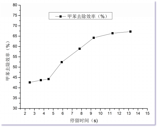 1、在一定范圍內(nèi),停留時(shí)間增加,甲苯的去除效率有明顯增高。原因是停留時(shí)間增加,185 nm紫外光和有機(jī)物碰撞次數(shù)增加。 2、當(dāng)停留時(shí)間達(dá)到11s后,延長(zhǎng)停留時(shí)間,甲苯的降解效率增加不明顯。尤其是在低濃度下,延長(zhǎng)停留時(shí)間并不能有效的增加甲苯去除效率。