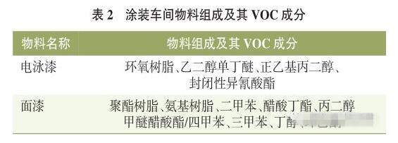 涂裝車間現(xiàn)狀 涂裝車間生產(chǎn)線介紹 涂裝車間生產(chǎn)線有:前處理電泳線、電泳烘干、打磨涂膠線、中涂噴漆線、中涂烘干、中涂打磨、面漆噴涂線、面漆烘干、精飾、塑料件噴涂線、塑料件烘干,其中VOCS產(chǎn)生環(huán)節(jié)為電泳烘干、涂膠PVC噴涂、中涂噴漆線、中涂烘干、面漆噴涂線、面漆烘干、塑料件噴涂線、塑料件烘干。 涂裝車間VOCs 涂裝車間VOCs成分 目前涂裝車間普遍使用油漆物料成分比較復(fù)雜,其大致成分詳見表2。
