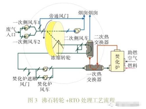 沸石轉(zhuǎn)輪吸附+RTO 1核心裝置介紹 疏水性沸石:其為硅鋁堿氫氧化合物,是由無數(shù)個四面體以三度空間所組成,藉由SiO2和AlO2來連接,其中心組成是鋁原子和硅原子,四周則有氧原子連接(AlSiO4)。鍵結(jié)后的沸石會形成不同形狀的孔隙。 蓄熱式燃燒爐(RTO):利用高溫氧化原理,將含揮發(fā)性有機物的廢氣在足夠溫度以及反應(yīng)時間的條件下,經(jīng)由燃燒過程而分解成CO2和H2O。 2系統(tǒng)原理 含揮發(fā)性有機物的廢氣通過空氣過濾器等預(yù)處理后,再經(jīng)過疏水性沸石濃縮轉(zhuǎn)輪,廢氣中的VOCs能被有效吸附于沸石中,達到去除的目的。經(jīng)過沸石轉(zhuǎn)輪吸附后的凈化氣體,直接通過煙囪達標(biāo)排放到大氣中。 沸石濃縮轉(zhuǎn)輪分為三個區(qū):吸附區(qū)、脫附區(qū)和冷卻區(qū)。沸石轉(zhuǎn)輪以每小時1-6轉(zhuǎn)的速度持續(xù)旋轉(zhuǎn),與此同時將吸附的揮發(fā)性有機物傳送到轉(zhuǎn)輪的脫附區(qū)。在脫附區(qū)中利用小股加熱氣體(180-220℃)將揮發(fā)性有機物進行脫附。脫附后的沸石轉(zhuǎn)輪旋轉(zhuǎn)到冷卻區(qū),經(jīng)冷卻后旋轉(zhuǎn)至脫附區(qū),持續(xù)吸附揮發(fā)性有機氣體。 脫附后的濃縮有機廢氣送到RTO燃燒爐進行燃燒,轉(zhuǎn)化成水和二氧化碳后排放到大氣中。利用熱交換將燃燒產(chǎn)生的熱量用來預(yù)熱脫附用氣體,并提供廢氣在燃燒爐燃燒前的預(yù)熱,使系統(tǒng)達到節(jié)能的功效。 3工藝流程 沸石轉(zhuǎn)輪+RTO處理工藝流程見圖3。