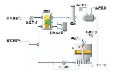 圖1蓄熱式廢氣處理工藝路線 2、成本分析 在此舉例分析蓄熱式廢氣處理工藝的運行成本和經(jīng)濟(jì)效益。某臺印刷機廢氣風(fēng)量約為20000Nm3/h,廢氣溫度約為40℃,廢氣濃度約為1.7g/Nm3(34kg/h),廢氣燃燒熱值約為6500kcal/kg。RTO設(shè)計風(fēng)量為22000Nm3/h,留有少量余量,設(shè)計熱效率為95%。RTO正常運行時,處理20000Nm3/h廢氣所需的風(fēng)機電耗約為40kW,在1.7g/Nm3廢氣濃度下需消耗7m3/h天然氣,來維持設(shè)備燃燒溫度。若電費按0.9元/kw•h、天然氣按3.5元/m3計算,則每小時的運行費用約為60元,費用并不高。如果廢氣濃度在2.1g/Nm3以上,則正常運行時不需要天然氣,燃燒器會自動關(guān)閉,所以只有風(fēng)機能耗費用,僅為36元/h。如果廢氣濃度遠(yuǎn)超過2.1g/Nm3,則可以回收余熱。余熱既可以用來給烘箱供熱,從而節(jié)省生產(chǎn)設(shè)備的能耗,也可以用來生產(chǎn)熱水和為建筑物供暖。可見,在廢氣有較多余熱的情況下,可以充分利用余熱創(chuàng)造效益。例如,若廢氣濃度為4g/Nm3(80kg/h),則可利用的最大余熱約為500000kcal。假設(shè)利用率為60%,可回收300000kcal。印刷機械運行所需的功率約為600000kcal(假設(shè)烘干溫度為80℃),可節(jié)約50%的能耗。如果濃度達(dá)到6g/Nm3,則可節(jié)約75%的能耗。如果采用氣-氣換熱系統(tǒng),回收的余熱產(chǎn)生的效益等于可以在兩年左右就收回設(shè)備投資。 綜上所述,該印刷包裝公司采用的有機廢氣處理技術(shù)有效控制了工廠VOCs的排放,并獲得了經(jīng)濟(jì)效益和社會效益。 來源:東莞市中仁環(huán)??萍加邢薰?/a>