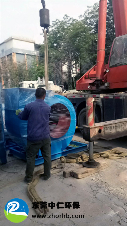 圖工作人員把水噴淋塔吊上車,這次的水噴淋塔材質(zhì)為PP板