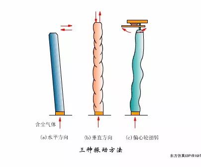 (a)為水平振動(dòng),有頂部和中部振動(dòng)兩種; (b)為垂直振動(dòng),它利用偏心輪裝置振打?yàn)V袋框架或定期提升濾袋框架進(jìn)行清灰; (c)為扭曲振動(dòng),它利用機(jī)械傳動(dòng)裝置定期將濾袋扭轉(zhuǎn)一定角度,使塵粒脫落。