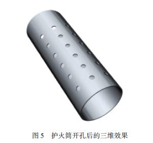 對(duì)比圖3和圖4的溫度分布可見(jiàn):不開(kāi)孔的護(hù)火筒內(nèi)壁溫度約1300K,比開(kāi)孔的護(hù)火筒內(nèi)壁溫度(1100K)高約200K。產(chǎn)生上述溫度差異的原因主要是在開(kāi)孔的情況下,護(hù)火筒內(nèi)的高溫氣體(約2000K)可通過(guò)護(hù)火筒上的小孔直接與爐膛內(nèi)的煙氣進(jìn)行換熱;而在不開(kāi)孔的情況下,護(hù)火筒內(nèi)的高溫氣體先與護(hù)火筒進(jìn)行換熱后,再經(jīng)由護(hù)火筒與爐膛內(nèi)的煙氣進(jìn)行換熱,其換熱速率明顯低于開(kāi)孔情況。因此,在選材上開(kāi)孔的護(hù)火筒要求更低,且使用壽命更長(zhǎng),其設(shè)計(jì)更優(yōu)。 護(hù)火筒開(kāi)孔后的三維效果見(jiàn)圖5。