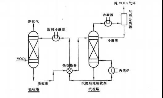 優(yōu)點(diǎn):冷凝法主要用于高沸點(diǎn)和高濃度的VOC污染氣體的回收,適用的濃度范圍>5%(體積),其流程簡(jiǎn)單、回收率高。 缺點(diǎn):該法需要有附設(shè)的冷凍設(shè)備,投資大、能耗高、運(yùn)行費(fèi)用大,同時(shí)冷凝后尾氣仍然含有一定濃度的有機(jī)物,二次污染嚴(yán)重,因此對(duì)低濃度尾氣治理本法很少使用。 2、吸收法 吸收法可分為化學(xué)吸收及物理吸收,由于有機(jī)廢氣中含有大量的“三苯”氣體,化學(xué)活性低,一般不能采用化學(xué)吸收。 物理吸收是廢氣中一種或幾種組分溶解于選定的液體吸收劑中,這種吸收劑應(yīng)具有與吸收組分有較高的親和力,低揮發(fā)性,同時(shí)還應(yīng)具有較小的揮發(fā)性,吸收液飽和后經(jīng)加熱解吸再冷卻重新使用。 常見工藝流程圖如下: