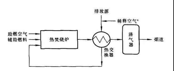 優(yōu)點(diǎn):直接燃燒法工藝簡(jiǎn)單、設(shè)備投資小,適用高濃度、小風(fēng)量的廢氣治理。 缺點(diǎn):能耗大,運(yùn)行成本較高;運(yùn)行技術(shù)要求高,不易控制與掌握,在國(guó)內(nèi)基本未獲推廣。 4、熱力燃燒法 熱力燃燒是指把廢氣溫度提高到可燃?xì)鈶B(tài)污染物的溫度,使其進(jìn)行全氧化分解的過程。 工藝流程圖如下: