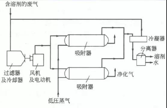 優(yōu)點(diǎn):催化燃燒器凈化率高、工作溫度低、能量消耗少、對(duì)可燃組分濃度和熱值限制少,操作簡(jiǎn)便和安全性好。 缺點(diǎn):有的氣體燃燒條件苛刻,需高溫、高空和高水蒸氣分壓,因此催化劑必須具備較高的活性、高熱穩(wěn)定性和較高的水熱穩(wěn)定性,以及一定的抗中毒能力。 6、活性炭吸附法 活性炭吸附是將有機(jī)廢氣由排氣風(fēng)機(jī)送人吸附床,有機(jī)廢氣在吸附床被活性炭吸附劑吸附而使氣體得到凈化,凈化后的氣體排向大氣即完成凈化過程。 工藝流程圖如下: