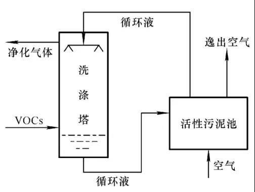 優(yōu)點(diǎn):吸附率高,運(yùn)行能耗低,費(fèi)用成本低,安全可靠,適用于有爆炸的危險(xiǎn)場(chǎng)所,吸附劑可以回收,節(jié)能環(huán)保。 缺點(diǎn):不耐高溫,在濕潤(rùn)的條件下不能保持很好的吸附能力;易燃,較快達(dá)到飽和吸附而失去效用;產(chǎn)生二次固體或液體污染物。 7、生物法 生物法是微生物將有機(jī)成分作為碳源和能源,并將其分解為CO2和H2O過程的一種方法。 工藝流程圖如下: