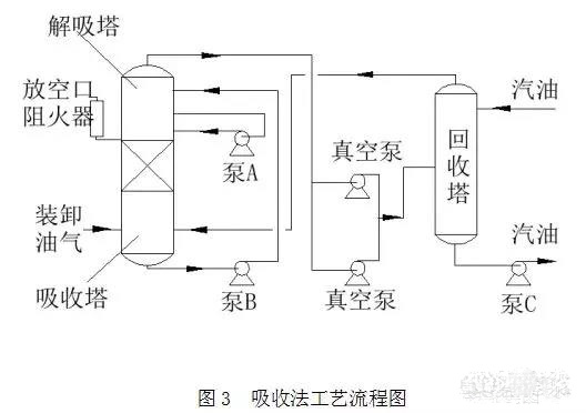 吸收法通常用于油氣回收。裝卸油品時產(chǎn)生的油氣進入吸收塔,從出口排出貧油空氣,解吸塔內(nèi)進行吸收液的真空解吸,解吸的吸收液再循環(huán)利用,回收塔用汽油將進入的解吸氣進行回收,尾氣返回吸收塔重復(fù)該過程。用溶液吸收法回收揮發(fā)性有機物的吸收液通常是特殊的吸收液,吸收液的選擇將影響回收效果。