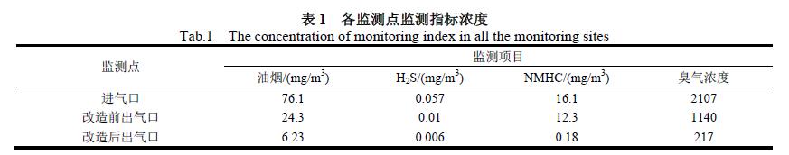 該工藝中光催化裝置經(jīng)優(yōu)化后具有以下優(yōu)點: (1)使用綜合凈化技術(shù)激發(fā)紫外光,裝置1 米處紫外光照強度提升至250μw/cm2 以上; (2)采用高速空氣流涂覆技術(shù)對紫外石英燈管覆膜,大大減小燈管漏氣率,并加強燈管的使用壽命,從8000h 提高到14000h,節(jié)約運行成本; (3)采用穩(wěn)定技術(shù)將催化劑負載到陶瓷基載體上,陶瓷基有較大的比表面積(500~700 2/g),有很好的吸附性能,大大增強了光催化效率。 二、主要構(gòu)筑物及工藝參數(shù) 2.1 噴淋塔(兩套) 設(shè)備材質(zhì)為聚丙烯(PP)塑料,空塔氣速1.0m/s。兩層填料(含鮑爾環(huán)Ø5 mm PP 填料),每層高1.5m,各配 備一只PP 螺旋噴嘴,噴淋密度為1 m3/(m2•h)。該設(shè)備含有包括PP 加藥槽在內(nèi)的自動加藥池。 2.2 活性炭吸附裝置(兩套) 設(shè)備材質(zhì)為304 不銹鋼。 2.3 高效油水分離器 設(shè)備材質(zhì)為304不銹鋼。 2.4 光催化凈化集成系統(tǒng) 2.5 引風(fēng)機(兩套) 設(shè)備材質(zhì)為碳鋼,靜壓3500Pa,功率45kW,變頻控制,電機防爆。 2.6 干式過濾器(兩套) 設(shè)備材質(zhì)為碳鋼。 2.7 排氣筒 設(shè)備材質(zhì)為纖維增強復(fù)合材料,配備井字架、纜風(fēng)繩、避雷針、采樣口、采樣平臺、防雨帽、排液口等。 三、工程運行分析 3.1 運行效果 廢氣處理工藝改造前后排氣口各指標(biāo)濃度和去除效率分別見表1和圖2。改造前廢氣處理系統(tǒng)出氣口H2S 濃度為0.01mg/m3,臭氣濃度為1140,均能達到國家排放限值。但由于臭氣較為敏感,雖低于國家規(guī)定的濃度值2000 的排放要求,但惡臭味依然明顯導(dǎo)致鄰避效應(yīng)問題突出。油煙和NMHC 濃度分別為24.3 和12.3mg/m3,均超出了標(biāo)準(zhǔn)限值的12和10mg/m3。H2S 因其良好的水溶性,在改造前的處理設(shè)備中的去除率可達到82%。處理設(shè)備進口中油煙含量偏高,處理效率需達到85 %以上才能達到國家排放標(biāo)準(zhǔn),而“兩級噴淋+兩級活性炭”組合工藝對油煙的去除率僅為68%,臭氣去除率為46%,NMHC 去除率則低至24%。處理效果不理想是因為改造前的處理工藝存在明顯弊端:一方面,油煙、某些NMHC、臭氣中的苯系物等廢氣水溶性較差,難以通過堿噴淋去除;另一方面,活性炭對廢氣的吸附量有限,尤其是堿噴淋處理后廢氣未進行干燥直接進入活性炭吸附箱時會攜帶大量水汽,與廢氣形成吸附競爭,使活性炭更快達到吸附飽和,導(dǎo)致對污染物的吸附效果驟減。