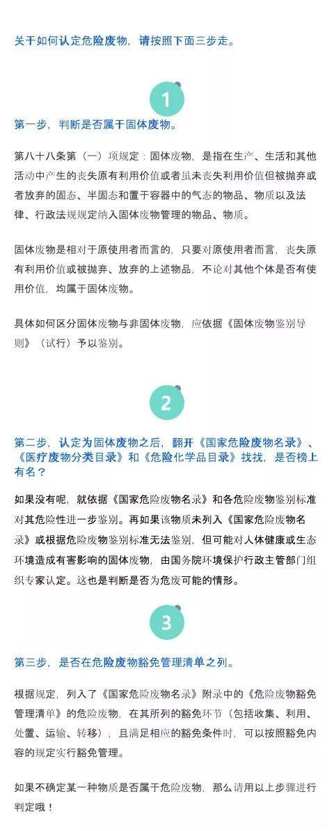 危險廢物的定義:根據(jù)《中華人民共和國固體廢物污染環(huán)境防治法》和《危險廢物經(jīng)營許可證管理辦法》,危險廢物是指列入《國家危險廢物名錄》或者根據(jù)國家規(guī)定的危險廢物鑒別標準和鑒別方法認定的具有危險特性的固體廢物。 該定義包括兩個方面的含義,一是危險廢物屬于固體廢物的一部分(換言之,某種物質(zhì)如果不屬于固體廢物,那么該物質(zhì)肯定不屬于危險廢物);二是危險廢物必須具有危險特性,危險廢物的特性常見有五種,分別為毒性(包括浸出毒性、急性毒性、生物毒性等)、腐蝕性、易燃性、感染性、化學反應性,具有一種或幾種危險特性的固體廢物屬于危險廢物。 危險廢物的屬性判別 危險廢物的屬性判別主要依據(jù)有兩個:一是根據(jù)危險廢物的定義,將納入《國家危險廢物名錄》(2016年版)中的廢物按照危險廢物進行管理; 其次對于屬性不確定的固體廢物,則根據(jù)《固體廢物鑒別導則》(2006年3月,原國家環(huán)??偩值任宀课娴?1號)以及《危險廢物鑒別標準-通則》(GB5085-2007)、《急性毒性初篩》、《浸出毒性鑒別》、《腐蝕性鑒別》、《反應性鑒別》、《易燃性鑒別》、《危險廢物鑒別技術規(guī)范》(HJ/T298-2007)等國家已出臺的危險廢物鑒別標準和方法,進行屬性鑒別。 2017年國家修訂出臺的《固體廢物鑒別標準-通則》(GB34330-2017),則上升為國家標準進行發(fā)布,在危險廢物的屬性判別方面,不僅具有強制效力,而且在管理層面上有了更強的可操作性。