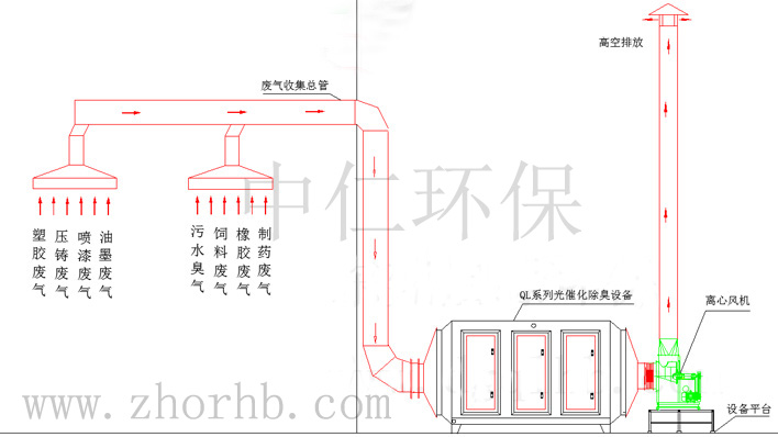 有機(jī)廢氣氣體利用排風(fēng)設(shè)備輸入到ZR系列UV紫外光光催化除臭設(shè)備后,凈化設(shè)備運(yùn)用高能UV紫外線光束及臭氧對(duì)惡臭氣體進(jìn)行協(xié)同分解氧化反應(yīng),使惡臭氣體物質(zhì)其降解化成低分子化合物、水和二氧化碳,再通過排風(fēng)管道排出室外。
