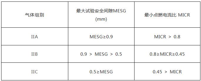 (即如上舉例的產(chǎn)品屬于隔爆型防爆型式。) 2. 設(shè)備類別 爆炸性氣體環(huán)境用電氣設(shè)備分為: I 類:煤礦井下用電氣設(shè)備; II 類:工廠用電氣設(shè)備 II 類隔爆型“ d ”和本質(zhì)安全型“ i ”電氣設(shè)備又分為 IIA 、 IIB 、和 IIC 類。 (舉例產(chǎn)品即屬于 II 類電氣設(shè)備,可以使用在除煤礦以外的其他爆炸性氣體環(huán)境。) 3. 氣體組別 爆炸性氣體混合物的傳爆能力,標(biāo)志著其爆炸危險程度的高低,爆炸性混合物的傳爆能力越大,其危險性越高。爆炸性混合物的傳爆能力可用最大試驗安全間隙表示。 同時,爆炸性氣體、液體蒸汽、薄霧被點燃的難易程度也標(biāo)志著其爆炸危險程度的高低,它用最小點燃電流比表示。 II 類隔爆型電氣設(shè)備或本質(zhì)安全型電氣設(shè)備,按其適用于爆炸性氣體混合物的最大試驗安全間隙或最小點燃電流比,進一步分為 IIA 、 IIB 和 IIC 類。如下表所示。 (該舉例產(chǎn)品可以使用于具有 IIB 類爆炸性氣體環(huán)境,也可以用于 IIA 的環(huán)境。)
