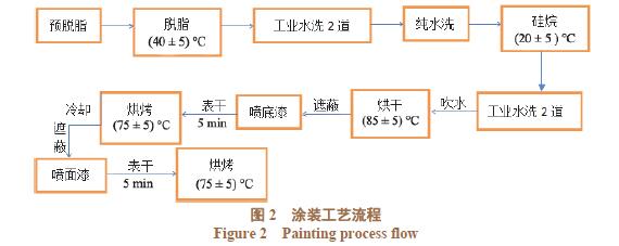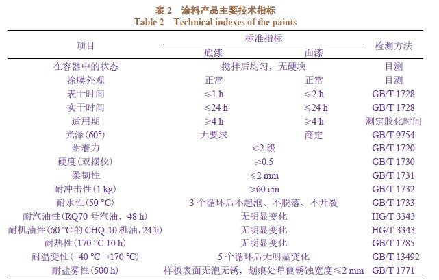 2.1.1 前處理 切換水性涂料后需注意工件表面油脂的清洗,目前生產(chǎn)現(xiàn)場基本能滿足要求,但需注意局部污染。 2.1.2 干燥過程 水性涂料烘烤前,需預(yù)留表干時(shí)間。以目前預(yù)留段鏈速及距離計(jì)算,表干時(shí)間足夠。 2.1.3 輸調(diào)漆系統(tǒng) 輸調(diào)漆系統(tǒng)分為底漆和面漆循環(huán)線,項(xiàng)目設(shè)計(jì)之時(shí)預(yù)留了水性涂料輸調(diào)漆功能,參數(shù)需摸索。 2.1.4 涂裝線配套設(shè)施 在半開放式發(fā)動(dòng)機(jī)涂裝線中,水性涂料對(duì)鍍鋅板等材質(zhì)的腐蝕影響較小。 2.1.5 其他 水性涂料與溶劑型涂料的特性有一定區(qū)別,涂裝工人的噴涂技巧及機(jī)器人的噴涂參數(shù)都需摸索。 2.2 產(chǎn)品的主要技術(shù)指標(biāo) 采用雙組分水性環(huán)氧底漆 +“濕碰濕”+ 水性聚氨酯面漆,按照表2所述性能及相關(guān)標(biāo)準(zhǔn)進(jìn)行檢測。