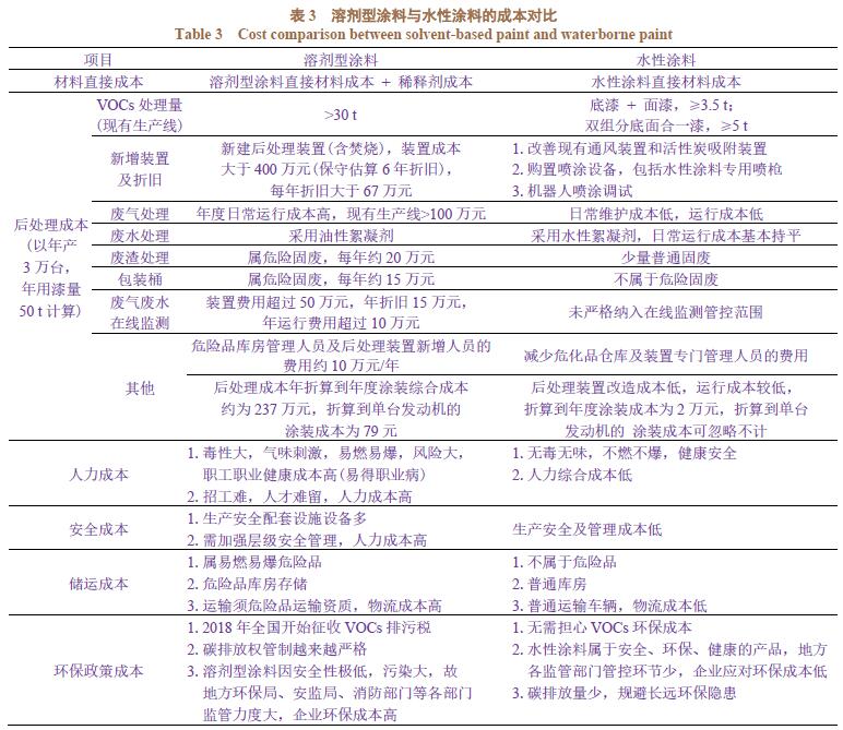2.3 施工要求 與溶劑型涂料相比,水性涂料的施工窗口窄,對(duì)施工應(yīng)用環(huán)境的溫度、濕度控制要求較高。涂裝環(huán)境溫度(23±2) °C,相對(duì)濕度(55±10)%的標(biāo)準(zhǔn)施工條件對(duì)獲得高品質(zhì)的漆膜外觀,控制流掛等漆膜弊病而言至關(guān)重要。濕膜閃干、預(yù)烘烤及烘烤條件對(duì)漆膜外觀的影響也較大。 2.4 設(shè)備要求 2.4.1 噴漆房 水性涂料的漆霧中含有大量的純水和少量助劑,會(huì)直接腐蝕噴漆室內(nèi)的結(jié)構(gòu)件,因此要求這些結(jié)構(gòu)件為不銹鋼材質(zhì)[2]。 2.4.2 空調(diào)系統(tǒng) 空調(diào)系統(tǒng)需具備制冷和除濕功能。 2.4.3 水性涂料的特殊閃干 油漆噴涂完成后需有10~15min 的閃干時(shí)間,之后再進(jìn)入烘干室。 2.4.4 噴涂機(jī)器人 靜電噴涂對(duì)機(jī)器人要求較高,但本線采用空氣噴槍,對(duì)機(jī)器人無特殊要求。 2.4.5 輸調(diào)漆系統(tǒng) 水性涂料需在5~30°C下儲(chǔ)存,調(diào)漆間需要具備恒溫恒濕的條件,以防止涂料結(jié)冰或過熱,保證涂料的穩(wěn)定性,調(diào)漆罐、管道等應(yīng)使用不銹鋼材質(zhì)。 2.5 小結(jié) 發(fā)動(dòng)機(jī)涂裝線除機(jī)器人、輸調(diào)漆系統(tǒng)需現(xiàn)場摸索施工參數(shù)外,前處理、噴涂、干燥等工藝均適合切換為水性涂料。若人工噴涂,直接采用現(xiàn)有的經(jīng)典配套切換至水性涂料(水性底漆 + 水性面漆),基本無客觀風(fēng)險(xiǎn)。 三、兩種改造方案的對(duì)比分析 現(xiàn)有生產(chǎn)線溶劑型涂料與水性涂料耗量及綜合成本對(duì)比分析見表3。