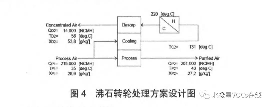 二、 VOC濃縮焚燒處理系統(tǒng)組成介紹 VOC濃縮焚燒處理系統(tǒng)的主要組成包括:過(guò)濾單元、沸石轉(zhuǎn)輪模組,廢氣主風(fēng)機(jī)、氧化焚燒爐、廢氣風(fēng)管、消防安全系統(tǒng)和電控系統(tǒng)等,下面就主要系統(tǒng)做分別介紹: 2.1沸石轉(zhuǎn)輪的結(jié)構(gòu)設(shè)計(jì) 2.1.1技術(shù)方案設(shè)計(jì) 目前沸石轉(zhuǎn)輪主要依靠進(jìn)口,世界范圍內(nèi)沸石技術(shù)較完善的有日本西部技研公司(Seibu Giken)和美國(guó)的蒙特公司(Munters)等等。根據(jù)前面介紹的原理,轉(zhuǎn)輪供應(yīng)商一般會(huì)依據(jù)油漆材料里面的組成來(lái)調(diào)整沸石轉(zhuǎn)輪的配方;同時(shí)整個(gè)廢氣處理的過(guò)程必須遵循VOC物料守恒原理和能量守恒原理。下圖4為某清漆噴房廢氣的技術(shù)方案,為了滿(mǎn)足VOC排放控制的法規(guī),必須確保最終排放的廢氣達(dá)標(biāo)排放,且進(jìn)出口的處理效率不得低于90%。
