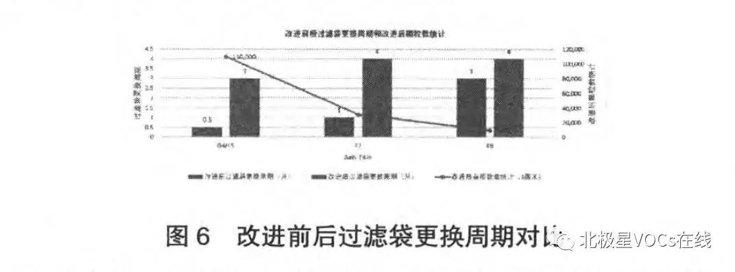 從上圖可以看出,當(dāng)P4處于所有風(fēng)管風(fēng)壓最小位置時(shí),確保了所有廢氣最終都是流向出口段;且解析段進(jìn)出口壓差較脫附段、冷卻段的壓差為最小時(shí),確保了脫附段和冷卻段溢流處的廢氣都能流進(jìn)解析段出口,從而保證整個(gè)轉(zhuǎn)輪的廢氣密封性。 2.2過(guò)濾單元的選型 常規(guī)干式噴房廢氣過(guò)濾方案為:F7過(guò)濾袋+F9過(guò)濾袋,而濕式文丘里噴房為了攔截逃逸出的漆霧和漆渣,過(guò)濾配置需要加強(qiáng)為:G4無(wú)紡布/F5過(guò)濾袋+F7過(guò)濾袋+F9過(guò)濾袋,但是在長(zhǎng)時(shí)間的高濕度環(huán)境下,通過(guò)靜電吸附方式的F9過(guò)濾袋容易快速失去過(guò)濾攔截功能。而一旦較小粒徑的漆霧顆粒穿過(guò)過(guò)濾袋進(jìn)入沸石轉(zhuǎn)輪,就有可能黏附在沸石內(nèi)部造成沸石轉(zhuǎn)輪堵塞的風(fēng)險(xiǎn)。根據(jù)實(shí)驗(yàn)驗(yàn)證出的優(yōu)化方案為:G4/F5自撐開(kāi)過(guò)濾袋+F7過(guò)濾盒+F9過(guò)濾盒,改進(jìn)后的過(guò)濾袋更換周期和轉(zhuǎn)輪前的雜質(zhì)顆粒數(shù)量都得到了明顯改善。下表6為某過(guò)濾單元配置優(yōu)化前后的效果對(duì)比: