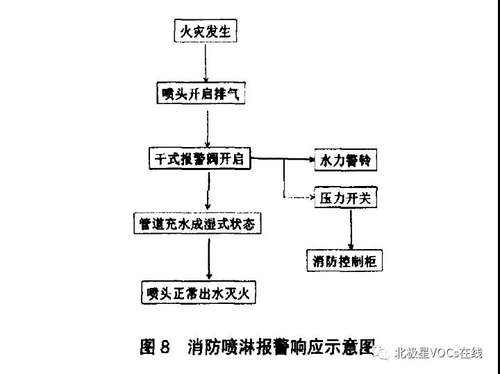 2.4氧化焚燒爐的功能介紹 直燃式氧化爐的組成主要包括:氧化焚燒爐,天然氣模組,廢氣進(jìn)風(fēng)機(jī)和點(diǎn)火控制系統(tǒng)等。從沸石轉(zhuǎn)輪解析出來(lái)的高濃度廢氣首先進(jìn)入直燃式氧化爐被余熱,然后在天然氣的燃燒室內(nèi)被高溫裂解氧化。為了保證充分處理VOC物質(zhì),廢氣在直燃式氧化爐內(nèi)停留時(shí)間不得低于1s,爐膛內(nèi)焚燒溫度不得低于710度。經(jīng)高溫裂解后的廢氣中CO濃度要求低于50mg/m3,NOx低于100mg/m3。衡量直燃式氧化焚燒爐性能指標(biāo)有:其凈化效率不得低于99%,其熱利用率不得低于75%。 2.5消防安全系統(tǒng)的介紹 經(jīng)過(guò)噴房排放的VOC廢氣屬于易燃易爆類(lèi)物質(zhì),經(jīng)過(guò)的區(qū)域都屬于防火防爆控制區(qū)域,相關(guān)電氣元件選型需要防爆安全認(rèn)證,并在涉及區(qū)域內(nèi)根據(jù)需要配備必要的消防安全設(shè)施。 2.5.1消防噴淋系統(tǒng) 當(dāng)VOC濃縮焚燒系統(tǒng)布置于車(chē)間外時(shí),根據(jù)需要在廢氣風(fēng)管和過(guò)濾單元內(nèi)配置消防噴淋設(shè)施,也包括所在的鋼平臺(tái)頂部或者屋頂區(qū)域。 當(dāng)閉式消防噴淋系統(tǒng)處于車(chē)間外部時(shí),在冬天零度以下環(huán)境中容易發(fā)生噴淋頭被凍壞的情況,為此優(yōu)化使用一種閉式噴淋頭+干式報(bào)警閥相結(jié)合的配置方案,未有火情時(shí),管道中充滿(mǎn)壓縮空氣,干式報(bào)警閥通過(guò)閉鎖隔瓣及空氣碟的構(gòu)件構(gòu)成了一個(gè)機(jī)械式的密封裝置,將閥體上腔及管道中的壓縮空氣和下腔進(jìn)水完全分開(kāi),使閥瓣保持在關(guān)閉狀態(tài)。為了防止壓縮空氣泄露引發(fā)誤報(bào)警,往往會(huì)配備一個(gè)儲(chǔ)氣罐。其報(bào)警響應(yīng)示意如下圖8:
