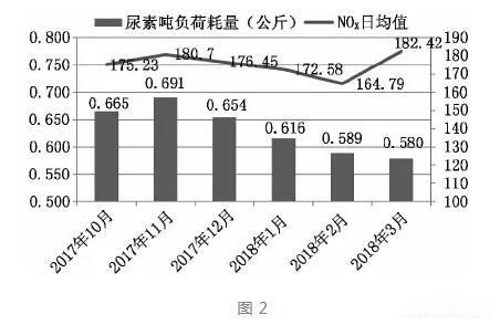由圖1可以看出,經(jīng)過(guò)優(yōu)化調(diào)整,飛灰含碳量得到有效控制。低氮燃燒器改造前飛灰含碳量平均值2.49%,改造后飛灰含碳量平均值4.13%;優(yōu)化調(diào)整后飛灰含碳量平均值3.12%,較改造前飛灰含碳量平均值升高0.63%。比對(duì)表3,改造優(yōu)化后飛灰含碳量控制在較合理的范圍內(nèi)。 2.3、SNCR脫硝運(yùn)行情況 2.3.1、溫度場(chǎng)改變,反應(yīng)窗口后移 低氮燃燒器改造后,通常會(huì)導(dǎo)致?tīng)t膛出口排煙溫度上升,具體表現(xiàn)在過(guò)熱器容易超溫、噴水減溫水量增大等現(xiàn)象。應(yīng)重新校對(duì)鍋爐溫度場(chǎng),在滿足尿素?zé)峤獾暮线m位置增加噴槍,以提高該溫度區(qū)域尿素平面充滿度和爐膛穿透深度,減輕煙氣中氨濃度偏斜偏流情況。 具體方案為:在鍋爐標(biāo)高26140mm處的前墻增開5個(gè)孔,布置5個(gè)110°扇形噴槍。根據(jù)原SNCR噴槍廠家提供的資料、噴槍(流量范圍為60L/h~250L/h)模擬的速度場(chǎng)與溫度場(chǎng),新增5個(gè)噴槍與下層噴槍并聯(lián)布置。新增噴槍投運(yùn)后,SNCR總的噴氨量應(yīng)保持不變,并嚴(yán)格控制新增5個(gè)噴槍的壓縮空氣壓力和尿素溶液壓力,壓縮空氣壓力不應(yīng)超過(guò)0.3MPa,尿素溶液壓力不應(yīng)超過(guò)0.35MPa~0.45MPa,噴槍流量不應(yīng)超過(guò)250L/h,防止噴射距離過(guò)長(zhǎng)導(dǎo)致屏式過(guò)熱器腐蝕。 在運(yùn)行調(diào)試中,逐步調(diào)整5個(gè)新增噴槍的流量,新增每個(gè)噴槍流量從120L/h開始調(diào)整,并同步減少原6個(gè)噴槍的流量,以總噴尿素溶液量保持不變?yōu)樵瓌t。在新增5個(gè)噴槍投運(yùn)后,如果NOX濃度下降,可逐步增加5個(gè)噴槍的流量,繼續(xù)減少原6個(gè)噴槍的流量。在調(diào)整過(guò)程中,壓縮空氣壓力不應(yīng)超過(guò)0.3MPa,尿素溶液壓力不應(yīng)超過(guò)0.35MPa~0.45MPa,噴槍流量不應(yīng)超過(guò)250L/h。 在保持稀釋水量不變的情況下,減少原噴槍噴尿素溶液量,采用低濃度噴氨,提高氨在煙氣中分散度. 2.3.2、SCR的效率較低 導(dǎo)致SCR脫硝效率降低的原因如下: 1)低氮燃燒器投運(yùn)后,爐膛斷面煙氣溫度場(chǎng)發(fā)生較大變化,爐膛斷面NOX濃度分布有較大差異。而尿素噴槍設(shè)計(jì)按照均布方式設(shè)計(jì),使得局部區(qū)域氨過(guò)量,其它區(qū)域氨欠量。這種不均勻性一直延伸到SCR反應(yīng)區(qū),最終導(dǎo)致脫硝效率較低。 解決方法:優(yōu)化流場(chǎng),增加蒸汽擾動(dòng)器或氣流均布器,根據(jù)NOX分布合理調(diào)整各個(gè)噴嘴的尿素溶液供給量。 由于僅依靠墻式噴槍,很難達(dá)到還原劑與煙氣中的NOX均勻混合,因此在水平煙道出口的右側(cè)布置4個(gè)蒸汽擾動(dòng)孔,通過(guò)高速噴入的蒸汽對(duì)煙氣進(jìn)行擾動(dòng),或采用噴氨格柵,提高噴氨均勻性,促進(jìn)煙氣中NH3和NOX的混合。 在鍋爐水平煙道到垂直煙道段的轉(zhuǎn)折室,增設(shè)蒸汽擾動(dòng)裝置,以提高煙氣流暢的均勻性;根據(jù)NOX濃度斷面分布特性,合理調(diào)整各個(gè)噴槍的流量,以達(dá)到較小尿素耗量條件下較高的SNCR和SCR脫硝效率。 2)催化劑性能下降。 解決方法:更換催化劑。在采取其他措施后,如果氨耗量仍然高于理論氨耗量,或脫硝指標(biāo)達(dá)不到設(shè)計(jì)值,需采取更換催化劑的措施,以增加催化劑活性,并適當(dāng)增加催化劑體積,提高SCR段的脫硝效率。 2.3.3、脫硝系統(tǒng)分配計(jì)量裝置精度低 尿素溶液調(diào)節(jié)門設(shè)計(jì)過(guò)大,在小流量調(diào)節(jié)過(guò)程中精度低,使尿素溶液用量波動(dòng)大,NOX出口值波動(dòng)較大。解決方法:更換合適的調(diào)節(jié)門,使尿素溶液的流量處于調(diào)節(jié)門的主調(diào)節(jié)區(qū)范圍內(nèi),提高調(diào)節(jié)精度。 2.4、CEMS的NOX、氨逃逸等測(cè)量數(shù)據(jù)不準(zhǔn)確 2.4.1、NOX的測(cè)點(diǎn)后移 原有CEMS的測(cè)點(diǎn)布置在鍋爐出口的混合煙道上,該處氣流較為混亂,不滿足CEMS測(cè)點(diǎn)布置要求,將測(cè)點(diǎn)后移5m~6m,布置于分叉管道上;采用笛型管多點(diǎn)取樣,可提高測(cè)量準(zhǔn)確性。 2.4.2、氨逃逸的測(cè)點(diǎn)前移 由于受布置條件限制,原氨逃逸測(cè)點(diǎn)遠(yuǎn)離SCR裝置出口。又由于飛灰對(duì)NH3有較強(qiáng)的吸附作用,使得實(shí)際測(cè)得的氨逃逸數(shù)據(jù)失真,將氨逃逸測(cè)點(diǎn)上移至靠近SCR出口的附近。采用笛型管多點(diǎn)取樣,可提高測(cè)試準(zhǔn)確性。 2.4.3、進(jìn)行灰分中氨濃度的化驗(yàn),確保氨濃度≤50μg/g 根據(jù)已運(yùn)行脫硝項(xiàng)目的經(jīng)驗(yàn),氨逃逸量和飛灰中氨含量有一定對(duì)應(yīng)規(guī)律,因此可以通過(guò)定期檢測(cè)飛灰中氨濃度,間接判斷實(shí)際氨逃逸量。 3、效果 如圖2所示,2017年12月份完成改造前后對(duì)比,尿素噸負(fù)荷耗量呈下降趨勢(shì),且降低明顯。NOX排放日均值相對(duì)穩(wěn)定,且略有降低。