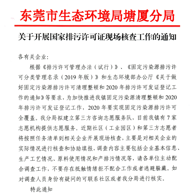 根據(jù)《排污許可管理辦法(試行)》、《固定污染源排污許可分類管理名錄(2019年版)》和生態(tài)環(huán)境部辦公廳《關(guān)于做好固定污染源排污許可清理整頓和2020年排污許可發(fā)證登記工作的通知》等要求,為加快推進(jìn)我鎮(zhèn)固定污染源清理整頓和2020年排污許可發(fā)證登記工作,2020年要實(shí)現(xiàn)固定污染源排污許可全覆蓋。我分局?jǐn)M建立第三方咨詢志愿服務(wù)隊(duì),目前我鎮(zhèn)有7家志愿機(jī)構(gòu)提供志愿服務(wù)。近期社區(qū)(工業(yè)園區(qū))和第三方志愿者將按照任務(wù)清單到相關(guān)企業(yè)開展現(xiàn)場核查,主要是對(duì)相關(guān)企業(yè)的實(shí)際情況進(jìn)行核查和協(xié)助填報(bào),調(diào)查內(nèi)容主要包括企業(yè)基本信息、生產(chǎn)工藝情況、原料使用情況和產(chǎn)排污情況等,請(qǐng)各單位主動(dòng)配合調(diào)查工作,不要存在抵觸情緒拒不配合工作或者逃避躲藏。如對(duì)調(diào)查人員身份有疑問的可聯(lián)系社區(qū)或者我分局進(jìn)行核實(shí)。