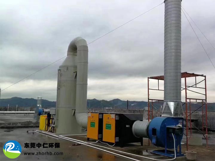 工業(yè)廢氣由風管引入凈化塔,經過填料層,廢氣與氫氧化鈉吸收液進行氣液兩相充分接觸吸收中和反應,工業(yè)廢氣經過凈化后,再經除霧板脫水除霧后由風機排入大氣。吸收液在塔底經水泵增壓后在塔頂噴淋而下,然后回流至塔底循環(huán)使用。沒有完全凈化的廢氣在經過UV光氧催化設備進行二次處理,凈化率可達98%以上,完全可以達到國家及地方標準。