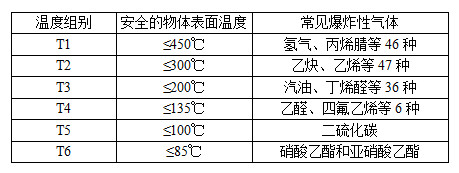說明:a、可燃性氣體、蒸氣的傳爆級(jí)別也是電氣設(shè)備的防爆級(jí)別,兩者是一致的。b、可燃性氣體、蒸氣的引燃溫度組別與電氣設(shè)備最高表面溫度組別一一對(duì)應(yīng)。