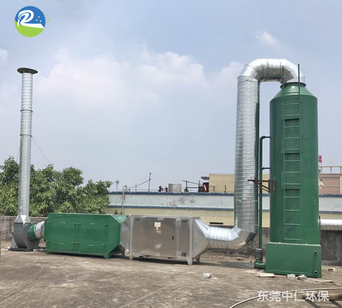 噴膠廢氣進入到噴淋塔—>通過水洗—>噴淋—>過濾以后—>UV光解凈化器—>離心風機—>達標排放。