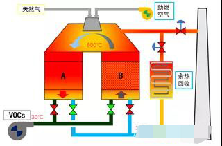 兩室RTO 第一代RTO焚燒爐是兩室RTO,也就是具有兩個蓄熱室,較TO直燃爐主要增加了蓄熱室,因熱效率高而受到歡迎。但是兩室RTO會導(dǎo)致未完全分解的有機廢氣在閥門切換過程中隨排氣排出,限制了廢氣去除效率增高的可能性,在這樣的情況下就誕生了三室RTO,也就是第二代RTO。