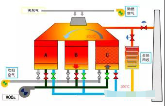 三室RTO 三室RTO與兩室RTO相比增加了一個蓄熱室,多出的蓄熱室的主要作用是吹掃,可以有效改善兩室RTO內(nèi)部氣流在換向過程中VOCs的直接排放問題,從而提高凈化效率。但由于三室RTO增加了一個蓄熱室,導(dǎo)致設(shè)備體積增大,表面散熱增多,整機能耗也升高。