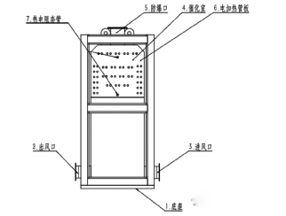 催化劑的裝填量一般根據(jù)廢氣量和空速比決定,當(dāng)然也與催化床層數(shù)有關(guān)系,一般設(shè)置4~5層為宜??紤]到經(jīng)濟(jì)性與實(shí)用性,催化劑空速比選擇在10000h-1~15000h-1 之間??账俦仍?高,成本就越高,反之亦然。催化劑的活性溫度在350℃左右, 對有機(jī)廢氣處理效率可達(dá) 97%,溫度越高活性越好,但超過 600℃會造成貴金屬涂層的損壞。 催化床層預(yù)熱一般采用電加熱。如果采用燃燒器,需要與催化劑保持一定距離,以免對催化劑造成損害。現(xiàn)在催化爐較為普遍的做法是將催化床與換熱器做在一起,比較緊湊,方便運(yùn)輸。其結(jié)構(gòu)如下圖所示: