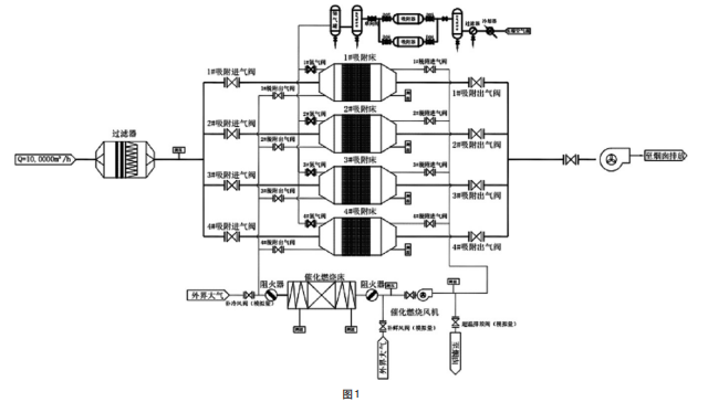 3、活性炭吸附脫附+催化燃燒工作原理 該組合運(yùn)行流程為:低濃度VOCs有機(jī)廢氣進(jìn)若干個活性炭箱,被活性炭充分吸附,凈化后有機(jī)廢氣直接從煙囪排出。吸附飽和的活性炭箱停止進(jìn)入廢氣,來自催化燃燒爐的高溫潔凈氣體進(jìn)入碳箱進(jìn)行脫附,脫附出來的高濃度有機(jī)廢氣,進(jìn)入催化燃燒爐凈化(由于是高濃度有機(jī)廢氣,所以運(yùn)行費(fèi)用很低),處理后的高濃有機(jī)廢氣被分解為潔凈氣體,通過煙囪排走。脫附完成的碳箱處于待命狀態(tài),待其他碳箱吸附飽和開始脫附時候,其立即開始吸附工作,如此重復(fù)。 其工藝流程如圖1 所示。圖 1 中以 10,0000Nm3 /h 風(fēng)量,濃度約在 200mg/Nm3 的廢氣處理項(xiàng)目為例。碳箱、催化爐以及整個系統(tǒng)設(shè)計(jì)如圖所示,僅供參考。這2個工藝組合起來,非常適合在大風(fēng)量,濃度在200mg/ Nm3 左右的工況下使用,既彌補(bǔ)了單純靠活性炭吸附造成活性炭浪費(fèi),不能重復(fù)利用的缺點(diǎn),又彌補(bǔ)了單純靠催化燃燒爐,運(yùn)行費(fèi)用高昂的問題,同時相比較起來其一次性投資成本也降低不少。