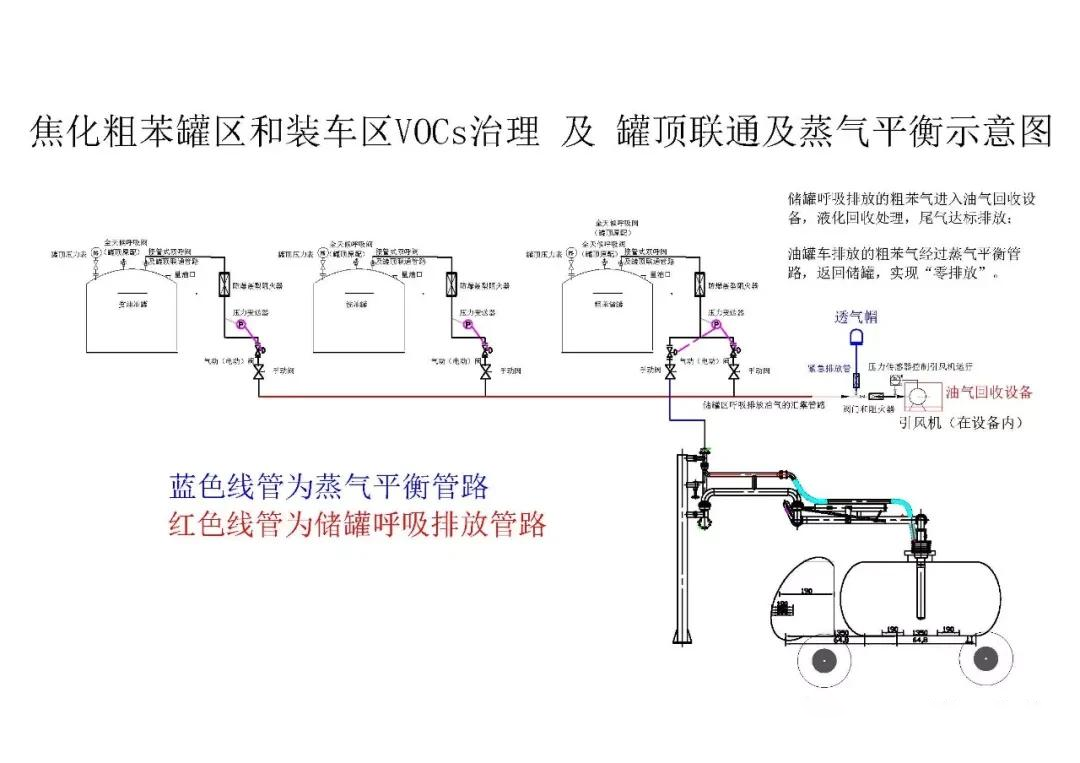 三、各工段治理技術(shù) (1)粗苯罐區(qū) 粗苯罐區(qū)為廢氣回收系統(tǒng),選取冷凝回收+活性炭吸附+裝車蒸汽平衡的處理技術(shù)。其粗苯罐區(qū)VOC治理示意圖如下所示: