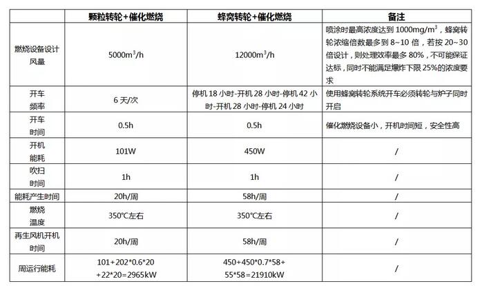 廢氣治理設(shè)施示意 因企業(yè)整個生產(chǎn)周期中VOCs產(chǎn)生的濃度波動性很大,最高濃度可達(dá)1400mg/m3左右,同時風(fēng)機(jī)也是根據(jù)生產(chǎn)情況開與停。若是采用傳統(tǒng)的蜂窩沸石濃縮轉(zhuǎn)輪,在VOCs濃度波動很大的情況下,很難保證廢氣時刻都能達(dá)標(biāo)排放,且設(shè)備運(yùn)行能耗、運(yùn)行維護(hù)代價增加,設(shè)備壽命降低,安全風(fēng)險(xiǎn)提高。為解決此問題,項(xiàng)目進(jìn)行了工藝優(yōu)化。 一是采用了顆粒沸石轉(zhuǎn)輪代替?zhèn)鹘y(tǒng)的蜂窩沸石轉(zhuǎn)輪,主要有如下優(yōu)點(diǎn): (1) 單位體積內(nèi)的顆粒分子篩重量遠(yuǎn)遠(yuǎn)大于蜂窩轉(zhuǎn)輪,因而轉(zhuǎn)輪抗?jié)舛炔▌幽芰?qiáng),在高濃度下也能保持高效運(yùn)行。 (2) 在整個噴涂生產(chǎn)周期內(nèi),爐子不開啟,轉(zhuǎn)輪處于靜止?fàn)顟B(tài),只起到吸附的作用。對于風(fēng)機(jī)的開停,只需一個按鈕,不需要復(fù)雜的開停爐過程,無安全風(fēng)險(xiǎn),同時無能耗產(chǎn)生,運(yùn)行維護(hù)簡單。 (3) 不受風(fēng)量減少的影響。 二是基于廢氣定性和定量分析,優(yōu)化轉(zhuǎn)輪設(shè)計(jì) (1) VOCs定性分析:分子篩材料具有吸附選擇性,所以VOCs中含有具體哪些有機(jī)物,對材料選擇有重大影響,需對涂裝工序產(chǎn)生的VOCs進(jìn)行定性分析。對廢氣進(jìn)行采樣,用色譜質(zhì)譜儀做定性分析,結(jié)果表明對(間)二甲苯、乙苯、鄰二甲苯和甲苯的含量最高,分別占比40%、23%、15%和6%。 (2) VOCs定量分析:考慮到系統(tǒng)節(jié)能設(shè)計(jì),如轉(zhuǎn)輪可做到兩道漆涂裝作業(yè)時只吸附,最后單獨(dú)脫附,則系統(tǒng)為最佳節(jié)能狀態(tài)。所以,利用便攜式FID,測出一周期的波峰與波谷,配合總量計(jì)算,配置吸附材料用量。 綜上,根據(jù)相關(guān)數(shù)據(jù)計(jì)算,配置兩臺筒式顆粒轉(zhuǎn)輪和一臺5000m3/h的催化爐。兩道漆涂裝作業(yè)時,轉(zhuǎn)輪有足夠的吸附量,保證達(dá)標(biāo)的前提下,無需脫附,從而達(dá)到消化波峰的目的。最后在二道漆結(jié)束時,開啟脫附,分別脫附兩個轉(zhuǎn)輪。 技術(shù)與經(jīng)濟(jì)指標(biāo) 顆粒轉(zhuǎn)輪+催化燃燒與傳統(tǒng)的蜂窩轉(zhuǎn)輪+催化燃燒對比如圖所示,與蜂窩轉(zhuǎn)輪相比,顆粒轉(zhuǎn)輪有如下優(yōu)點(diǎn): (1) 設(shè)計(jì)風(fēng)量較小,為蜂窩轉(zhuǎn)輪風(fēng)量的41.7%,更加有利于廢氣的濃縮。 (2) 開機(jī)能耗較低,為蜂窩轉(zhuǎn)輪能耗的22.4%。 (3) 周運(yùn)行能耗較低,為蜂窩轉(zhuǎn)輪能耗的13.5%。