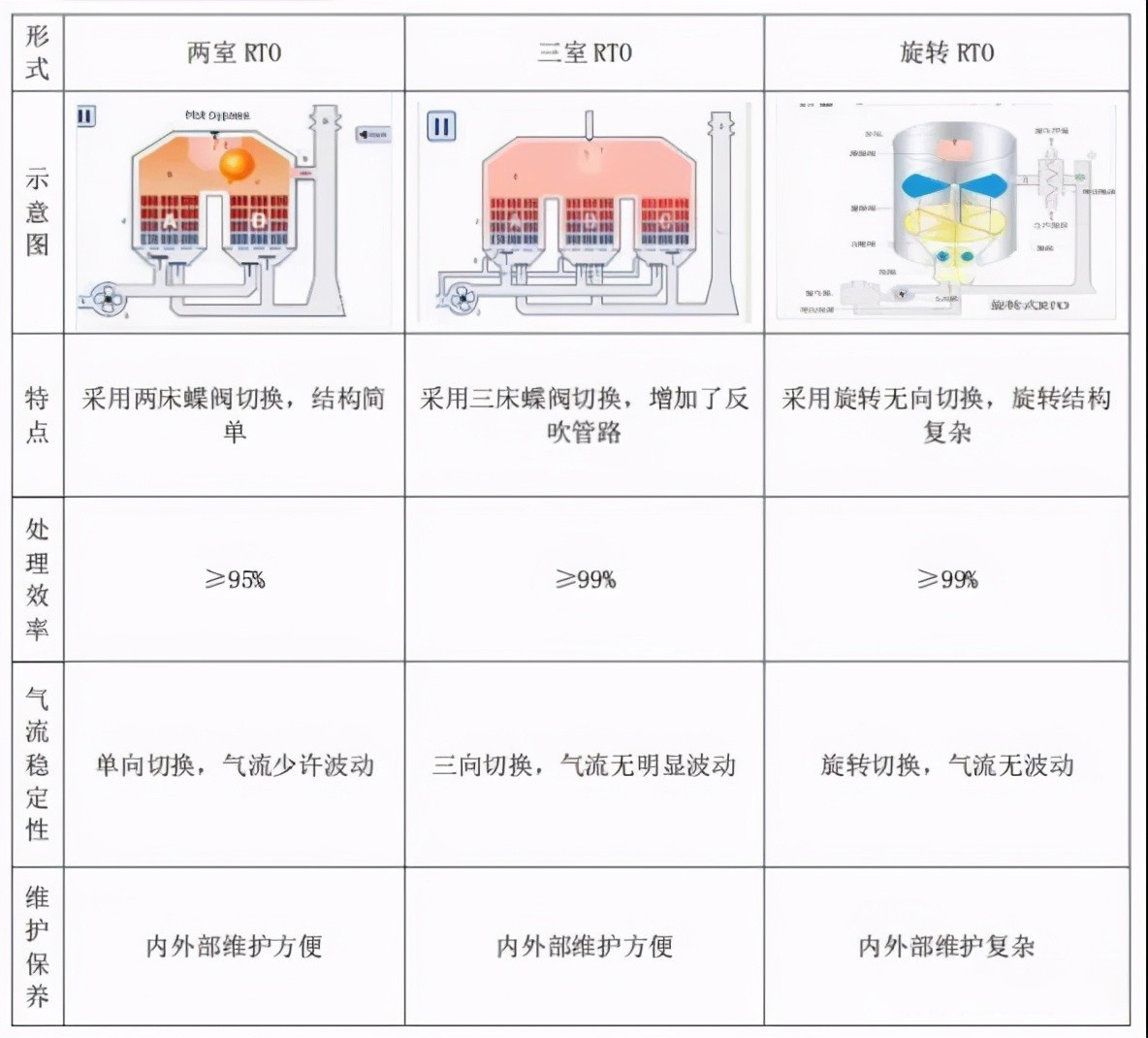 各種形式 RTO對比 因此,化工、石化、煤化工等行業(yè)內(nèi) VOCs治理項目的工作重心已經(jīng)由“油氣回收”轉(zhuǎn)變?yōu)榱?ldquo;達標排放”,而在油氣回收裝置中常見的作為末端工藝的可再生吸附法也逐漸被以焚燒(TO)或催化氧化(CO)為基礎(chǔ)的破壞法所取代。 破壞法通常需要較高溫度來確保排放廢氣中VOCs的去除效率,因此需要消耗大量能源(燃料、電)來維持反應(yīng)溫度,導(dǎo)致工藝整體能耗很高。 而通過將蓄熱反應(yīng)與TO/CO工藝結(jié)合形成的蓄熱式焚燒(RTO)或蓄熱式催化氧化(RCO)工藝,可以憑借其 90%以上的熱回收效率,大幅降低能耗。因此,RTO/RCO已經(jīng)成為近年來各行業(yè)中 VOCs凈化方案的主流選項。