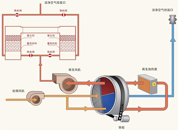按照北京市排放標(biāo)準(zhǔn)要求,2017年9月1日起,非甲烷總烴應(yīng)低于25 mg/m3,為滿足環(huán)保要求,北京某汽車涂裝車間需要安裝濃縮轉(zhuǎn)輪焚燒系統(tǒng),用來(lái)處理清漆噴漆室排出的含VOCs氣體。 廢氣濃縮沸石轉(zhuǎn)輪焚燒系統(tǒng)的工作原理 廢氣濃縮沸石轉(zhuǎn)輪焚燒系統(tǒng)是世界最領(lǐng)先的濃縮輪(沸石轉(zhuǎn)輪)的技術(shù),將有機(jī)廢氣中的有機(jī)物濃縮(本項(xiàng)目20 ∶ 1的濃縮比)。再將濃縮后的廢氣通過(guò)TAR焚燒,經(jīng)余熱回收后將燃燒后清潔的空氣排放,達(dá)到完全處理廢氣的效果。 1)廢氣通過(guò)引風(fēng)機(jī)進(jìn)入三組沸石濃縮轉(zhuǎn)輪進(jìn)行初步VOCs處理; 2)解附、濃縮后的高濃度有機(jī)廢氣進(jìn)入焚燒裝置先進(jìn)行預(yù)熱然后進(jìn)行高溫氧化處理; 3)燃燒后的高溫氣體排出對(duì)預(yù)熱裝置進(jìn)行換熱, 同時(shí)對(duì)管路進(jìn)行加熱,用于解附氣體。 通過(guò)此設(shè)備的高溫氧化分解,綜合廢氣處理效率可達(dá)95%,經(jīng)過(guò)處理后的廢氣完全可以達(dá)到幾乎零排放的高標(biāo)準(zhǔn)。
