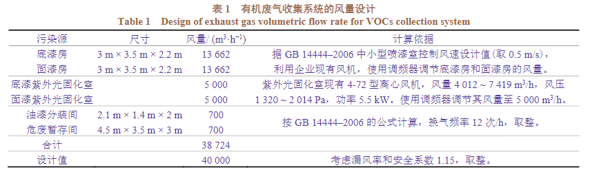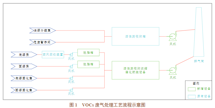 2. 3 有機(jī)廢氣處理工藝整改 據(jù)《四川省2018年度揮發(fā)性有機(jī)物(VOCs)減排核算方法說(shuō)明》,催化燃燒的VOCs去除效率為90%。該企業(yè)VOCs產(chǎn)生濃度經(jīng)計(jì)算約為188 mg/m3,若采用活性炭吸附濃縮后催化燃燒去除廢氣中90%的VOCs,則VOCs排放濃度為18.8 mg/m3,低于DB 51/2377–2017的VOCs排放限值60 mg/m3。 因此VOCs廢氣去除率和排放濃度可以同時(shí)達(dá)標(biāo)。為保護(hù)后端處理設(shè)備和提高油漆回收利用率,擬對(duì)噴漆室進(jìn)行脫脂預(yù)處理。揮發(fā)性有機(jī)廢氣主要來(lái)自噴漆房和固化室,因此這兩處采用脫脂箱(預(yù)處理)加活性炭吸附濃縮催化燃燒工藝。 為充分利用現(xiàn)有設(shè)備,底漆房的旋風(fēng)回收集漆霧設(shè)備保留,在其后端安裝脫脂箱,如圖1所示。油漆分裝間和危廢暫存間產(chǎn)生的揮發(fā)性有機(jī)廢氣少,濃度較低,并且持續(xù)產(chǎn)生,因此經(jīng)收集后利用現(xiàn)有活性炭吸附設(shè)備處理后排放。 2. 4 漆霧回收設(shè)備的整改 對(duì)噴漆室進(jìn)行脫脂預(yù)處理,保護(hù)了后端處理設(shè)備之余,又增大了油漆回收利用率。面漆房和底漆房分別配置一個(gè)脫脂箱,其處理能力大于收集風(fēng)量13 662 m3/h。 2. 5 末端控制設(shè)備的整改2. 5. 1 噴漆房和固化室的有機(jī)廢氣末端控制設(shè)備將現(xiàn)有的噴淋塔、UV 光解設(shè)備、活性炭吸附箱等末端控制設(shè)備改為活性炭轉(zhuǎn)輪濃縮−催化燃燒處理設(shè)備,它主要由活性炭轉(zhuǎn)輪濃縮、脫附系統(tǒng)、催化燃燒系統(tǒng)、控制系統(tǒng)等部分組成,要求處理能力達(dá)到40 000 m3/h,同時(shí)符合《催化燃燒法工業(yè)有機(jī)廢氣治理工程技術(shù)規(guī)范》(HJ 2027–2013)的要求。2. 5. 2 油漆分裝間和危廢暫存間有機(jī)廢氣的處理油漆分裝間和危廢暫存間的廢氣經(jīng)收集后,利用現(xiàn)有的活性炭吸附設(shè)備處理后排放。這兩處廢氣量為 1 400 m3/h,現(xiàn)有活性炭吸附設(shè)備尺寸為 0.9 m × 1.0 m × 1.3 m,算得廢氣風(fēng)速為 0.3 m/s,符合 HJ 2026–2013 標(biāo)準(zhǔn)中小于 1.2 m/s 的要求。因此現(xiàn)有活性炭吸附設(shè)備滿(mǎn)足這兩處廢氣的處理要求。