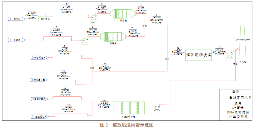 2. 6 通風(fēng)管的整改 VOCs 廢氣收集管網(wǎng)的設(shè)計(jì)與安裝應(yīng)根據(jù)廢氣性質(zhì)、廢氣量來(lái)確定管材、管徑,各并聯(lián)管路進(jìn)行調(diào)壓,根據(jù)壓力損失和風(fēng)量來(lái)選擇適用的風(fēng)機(jī)。各處理設(shè)施盡量縮短連接距離,減小通風(fēng)管道壓力損失。并聯(lián)風(fēng)管應(yīng)安裝壓力調(diào)節(jié)閥、密閉止回閥。各有機(jī)廢氣污染源的收集通風(fēng)管采用圓形管,長(zhǎng)度、管徑及壓力損失見(jiàn)圖 2。有機(jī)廢氣處理系統(tǒng)配置的風(fēng)機(jī)應(yīng)能克服管道和設(shè)備壓力損失。