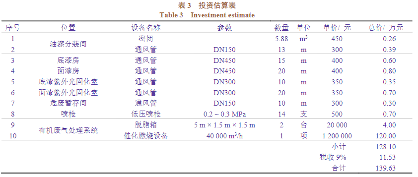 2. 7 整改工程投資及運(yùn)行費(fèi)用估算 VOCs 廢氣收集處理系統(tǒng)整改前后的對(duì)比見(jiàn)表 2。這次整改投資主要體現(xiàn)在活性炭吸附濃縮催化燃燒設(shè)備的采購(gòu)費(fèi)用和通風(fēng)管的整改費(fèi)用,具體的投資估算見(jiàn)表 3。
