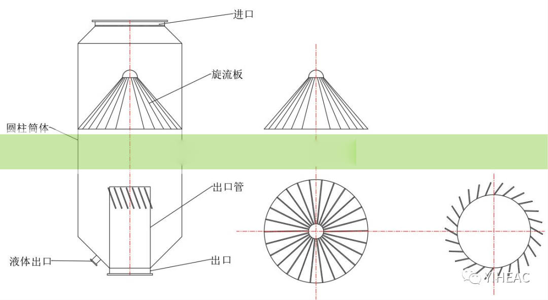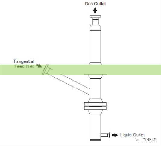 構(gòu)成:中部的圓柱體筒狀結(jié)構(gòu)、上下兩部分錐體結(jié)構(gòu)和錐形旋流板構(gòu)成旋流板式除沫器。如上圖所示,處于中間圓柱體筒狀結(jié)構(gòu)內(nèi)的旋流板是除沫的主要部分,一周按照一定傾斜角度和仰角的葉片構(gòu)成了中間的旋流板,當(dāng)氣流穿過旋流板時(shí)經(jīng)過葉片、穿過縫隙,氣流形成旋轉(zhuǎn)氣流,氣體和液體在旋流器內(nèi)做回轉(zhuǎn)運(yùn)動(dòng),由于旋流板式主要靠氣液兩相所受離心力進(jìn)行分離,回轉(zhuǎn)體內(nèi)液滴的離心力可以達(dá)到自身重力的10 倍甚至更高,因此氣流兩相分離效果十分明顯。 如上圖所示:旋流板內(nèi)豎直方向的傾角,徑向傾斜角度,其中豎直方向的傾角、徑向傾斜角度和葉片數(shù)量是旋流板除沫的三個(gè)重要結(jié)構(gòu)參數(shù)。 旋流板除沫器可以將兩相流中液滴直徑為 5-75μm的液滴進(jìn)行分離,對(duì)兩相流進(jìn)口速度非常敏感,適合分離速度較大的氣液兩相,當(dāng)氣流量大時(shí)分離效果明顯,但氣流量較小時(shí)分離不明顯,優(yōu)點(diǎn)是不易堵塞,壓降較小。 五、管柱式旋流氣液分離器 原理:用離心力來分離氣流中的液滴,液體與氣體形成氣液兩相流一起流動(dòng)時(shí),由于氣液密度差較大,液體受到的離心力遠(yuǎn)大于氣體,所以液體在離心力的作用下被甩出氣體,并附著在分離器壁上,附著在分離器壁面的液滴由于重力的作用向下匯集到一起,通過排放管排出。由于離心力遠(yuǎn)大于重力(大尺寸分離設(shè)備內(nèi)的離心力是重力的5倍,高壓小尺寸分離設(shè)備內(nèi)離心力達(dá)到重力的2500倍),因此離心分離的效率遠(yuǎn)高于重力分離,且其具有停留時(shí)間短、操作靈活、能穩(wěn)定連續(xù)運(yùn)行、設(shè)備體積小等諸多優(yōu)點(diǎn),使其成為研究最多的氣液分離方式。