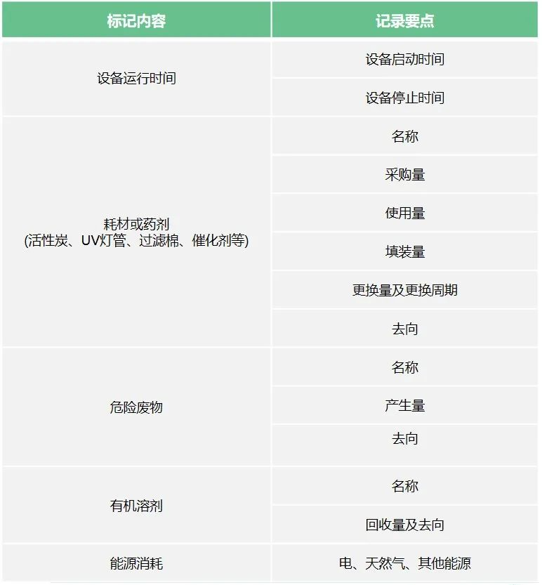 主要包括生產(chǎn)設(shè)備、治理設(shè)備的運行時間、設(shè)備運行參數(shù)、維護信息、耗材或藥劑、危險廢物、溶劑回收、能源消耗等信息。
