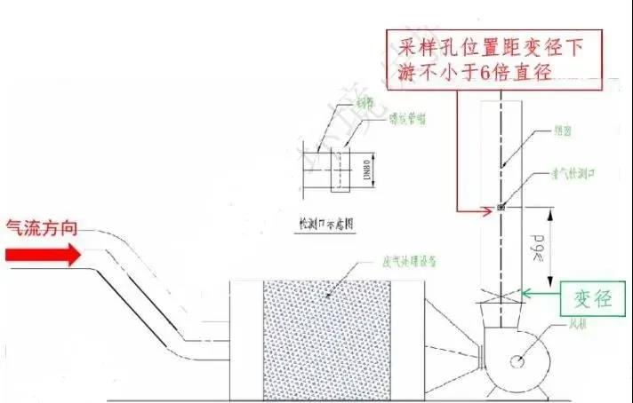 1、采樣位置應(yīng)優(yōu)先選擇在垂直管段,應(yīng)避開煙道彎頭和斷面急劇變化的部位。 2、采樣孔應(yīng)設(shè)置在距彎頭、閥門、變徑管下游方向不小于6倍直徑,和距上述部件上游方向不小于3倍直徑處(如上圖所示)。 3、依據(jù)相關(guān)標準和規(guī)范,廢氣處理設(shè)備下游段的排氣筒必須按規(guī)范開設(shè)采樣孔;風量大于10000m7/h且進口VOCs濃度大于200mg/m3的在處理設(shè)施上游段必須開設(shè)采樣孔。