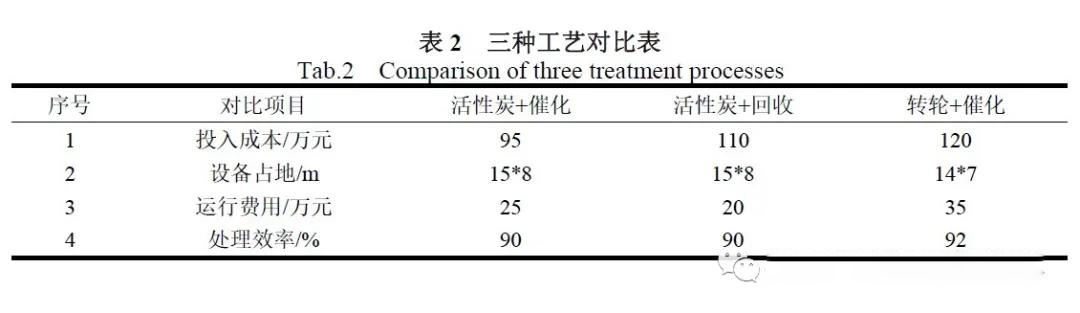 從上表可知,采用轉(zhuǎn)輪+催化燃燒的處理方式投資和運(yùn)行費(fèi)用相對(duì)來(lái)說(shuō)都比較高、此外由于廢氣中含有酸性及高沸點(diǎn)氣體可能會(huì)導(dǎo)致轉(zhuǎn)輪的使用壽命降低,但是具有去除效率高、排口穩(wěn)定達(dá)標(biāo)、占地小、操作維護(hù)簡(jiǎn)單等優(yōu)點(diǎn),對(duì)活性炭+催化燃燒工藝來(lái)說(shuō)投資費(fèi)用及運(yùn)行費(fèi)用相對(duì)較低,但是也存在蜂窩活性炭需要定期更換、排口濃度不穩(wěn)定、設(shè)備配電功率大等缺點(diǎn);對(duì)活性炭+冷凝回收工藝來(lái)說(shuō)投入相對(duì)較高但運(yùn)行費(fèi)用低、設(shè)備配電功率小,但是也存在著排口排放濃度不穩(wěn)定、活性炭需要定期更換、冷凝下來(lái)的有機(jī)物只能作為廢液等缺點(diǎn)而且需要額外供應(yīng)蒸汽和冷卻水。