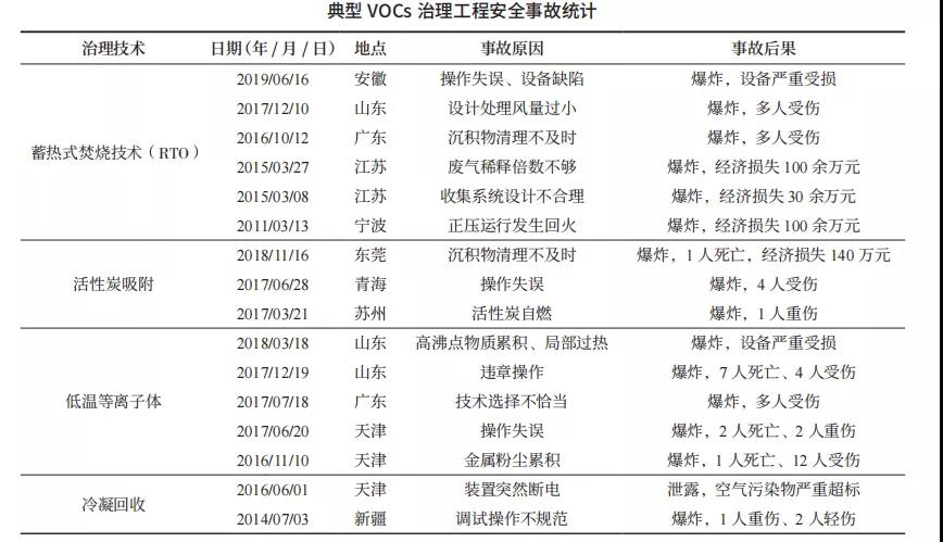 揮發(fā)性有機化合物在光照條件下會與大氣中的其他物質(zhì)發(fā)生化學(xué)反應(yīng)生成臭氧和二次有機顆粒物,是我國目前區(qū)域性大氣復(fù)合污染的主要污染物之一 。隨著我國經(jīng)濟規(guī)模不斷擴大VOCs 年總排放量將持續(xù)攀升,估 計 2020 年將達到 4100 萬 t 左右 。近年來,我國VOCs 治理行業(yè)蓬勃發(fā)展,但 VOCs 治理工程事故頻發(fā),其安全性卻并沒有引起足夠重視,其安全研究工作嚴重不足。 本文對近年來國內(nèi)公開報道的典型 VOCs 治理工程安全事故進行了統(tǒng)計,總結(jié)歸納了 VOCs 治理工程安全的研究進展,從安全研究和安全管理兩方面提出了解決 VOCs 治理工程安全問題的建議,以期為國內(nèi)同行提供借鑒。 一、VOCs 治理工程典型事故 近年公開報道的 VOCs 治理工程安全事故統(tǒng)計結(jié)果匯總見下表。由下表可知,這 16 起大小事故共造成了 11 人死亡,超過 30 人不同程度受傷,經(jīng)濟損失達數(shù)千萬元。從地域來看,事故主要集中分布在江蘇、山東、廣東、天津等地區(qū),這些地區(qū)都是 VOCs 治理工程建設(shè)密度較高的區(qū)域。從發(fā)生頻率來看,VOCs 治理工程安全事故呈逐年上升的態(tài)勢。在多種常用的治理技術(shù)中,蓄熱式焚燒(RTO)、活性炭吸附和低溫等離子體為事故高發(fā)技術(shù),危險性較高,當然,這與其建設(shè)數(shù)量較多也有一定的關(guān)系。由于 VOCs 具有易燃易爆性,導(dǎo)致絕大多數(shù)事故都為爆炸類事故,所造成的后果往往較嚴重。