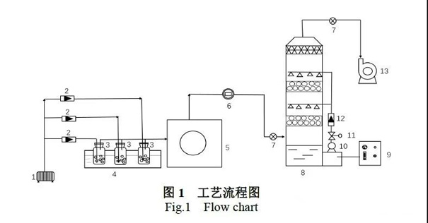一、 實驗部分 1.1 儀器與材料 Agilent7890B 型氣相色譜儀( 美國安捷倫科技公司) ;AD350S-2S2.2GB-20 型微納米氣泡發(fā)生裝置;噴淋塔裝置。苯、甲苯和二甲苯色譜純試劑(國藥集團化學試劑有限公司);鄰二甲苯、對二甲苯、間二甲苯色譜純試劑(上海麥克林生化科技有限公司)。實驗噴淋塔柱體為聚丙烯材料,塔直徑1.0 m,高3.0 m。塔內(nèi)分兩層噴淋,每層填料高度0.5 m。噴淋塔底部連通邊長0.5m的方形水箱,水箱里的微納米氣泡溶液經(jīng)離心泵提升至塔內(nèi)實現(xiàn)自下而上噴淋。 1.2 實驗流程 微納米氣泡噴淋降解涂裝廢氣系統(tǒng)由廢氣發(fā)生裝置、噴淋塔、微納米氣泡發(fā)生裝置等幾部分構(gòu)成。工藝流程如圖1 所示。氣體模擬裝置中通過小氣泵將氣體分三路通入盛有苯、甲苯和二甲苯溶液的鼓泡瓶中,由小氣泵產(chǎn)生的高濃度氣體與空氣在混風箱混合后形成低濃度、高風量的涂裝氣體。模擬氣體引入噴淋塔內(nèi)后自下而上與微納米氣泡在填料層逆向接觸發(fā)生超臨界水溶解、熱解、氧化還原等一系列反應實現(xiàn)氣體凈化,凈化后的氣體從塔頂引出。 1.3 評價方法 苯、甲苯和二甲苯的去除效果由各成分的降解效率表示。計算方法為: