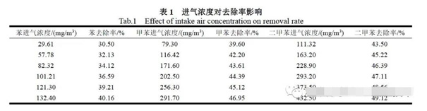二、結(jié)果與討論 2.1 進氣濃度變化對“三苯”氣體去除率的影響