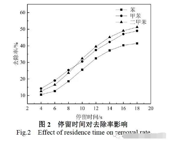 表1 為進氣濃度對“三苯”氣體去除率的影響。設置6 組同比例不同濃度的“三苯”混合氣體,停留時間16 s,噴淋液氣比3 L/m3。隨著進氣濃度的升高,苯、甲苯和二甲苯的去除率均呈上升趨勢,苯的去除率從30.5 %上升至40.16 %,甲苯的去除率從39.6 %上升至46.95 %,二甲苯的去除率從43.5 %上升至49.12 %。從雙膜理論分析氣膜中存在擴散阻力、化學阻力及氣體在液膜中的擴散阻力[7]。當混合氣體的濃度從低濃度逐漸升高時,氣液反應以氣膜控制為主,濃度的升高推動了氣體在氣膜中的傳質(zhì)推動力,在相同時間內(nèi)達到氣液界面的氣體越多,去除率越高。當氣體濃度達到一定值時,氣液反應以液膜控制為主,升高氣體濃度可以提高降解的氣體量,但降解的量遠小于氣體濃度的升量,整體的去除效率降低。 2.2 停留時間對“三苯”氣體去除率的影響
