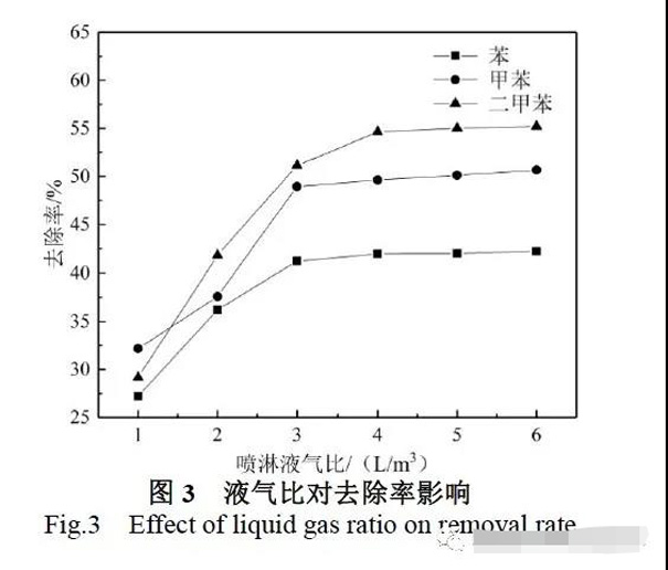 圖2 為停留時間對氣體去除率的影響。實驗條件:苯、甲苯和二甲苯的進氣濃度分別為140 mg/m3、280 mg/m3、420 mg/m3,噴淋液氣比3 L/m3,調(diào)控氣體停留時間為4s、6 s、8 s、10 s、12s、14 s、16 s、18 s。苯、甲苯和二甲苯的去除率隨停留時間延長而增高,當停留時間較短時,氣體在噴淋裝置中接觸不充分、反應不徹底,導致氣體的去除率較低。隨著停留時間延長,反應氣體與微納米氣泡接觸時間變長,廢氣分子被氣泡破滅產(chǎn)生的空化反應降解得更加徹底,廢氣的去除率逐漸增高。當停留時間為18 s 時,苯、甲苯和二甲苯的去除率達到41.43 %、49.01 %和51.21 %。“三苯”氣體中苯的去除率較低,主要原因有苯結(jié)構(gòu)穩(wěn)定,化學鍵鍵能高,難以被氧化降解;氣體中苯濃度最低,與微納米氣泡發(fā)生接觸、碰撞幾率相對較小,致反應不充分。 2.3 噴淋液氣比對“三苯”氣體去除率的影響