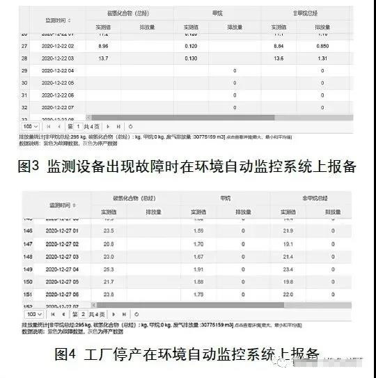 4) 數(shù)采儀。數(shù)采儀是由指定第三方部門提供,需聯(lián)網(wǎng)調(diào)試,由第三方專業(yè)人員實(shí)施。考慮預(yù)留后期增加上傳監(jiān)控平臺(tái)模塊及環(huán)保在線監(jiān)測(cè)數(shù)據(jù)的整合。 5) 監(jiān)測(cè)采樣口位置。監(jiān)測(cè)采樣口位置設(shè)置在垂直管段,應(yīng)避開煙道彎頭和斷面急劇變化的部位,設(shè)置在距彎頭、閥門、變徑管下游方向不小于4 倍直徑(或當(dāng)量直徑) 和距上述部件上游方向不小于2 倍直徑(或當(dāng)量直徑) 處。對(duì)矩形煙道,其當(dāng)量直徑D=2AB/(A+B),其中A、B 為邊長(zhǎng)。采樣口上游垂直方位應(yīng)設(shè)置比對(duì)采樣口,方便后續(xù)開展人工比對(duì)監(jiān)測(cè)工作。 6) 電源氣源的確認(rèn)。此部分工作需提前確認(rèn),保證現(xiàn)場(chǎng)能提供穩(wěn)定的不間斷的氣源及電源,該項(xiàng)目的氣源和電源分別接自涂裝車間內(nèi)的壓縮空氣主管路及主配電柜;同時(shí)監(jiān)測(cè)站房?jī)?nèi)配備穩(wěn)壓電源及UPS 電源(≥8 kW)。 3.2調(diào)試 調(diào)試主要分三部分,取樣檢測(cè)調(diào)試、數(shù)據(jù)上傳系統(tǒng)及視頻監(jiān)控系統(tǒng)調(diào)試,分別由相關(guān)專業(yè)人員進(jìn)行。監(jiān)測(cè)設(shè)備在整套系統(tǒng)調(diào)試完成后,進(jìn)行168 h 正常運(yùn)行后進(jìn)行初檢,初檢期間宜輔以人工取樣檢測(cè),一般為4 次/d 取樣檢測(cè);初檢合格后,進(jìn)入90d 現(xiàn)場(chǎng)運(yùn)行期;90 d 現(xiàn)場(chǎng)運(yùn)行符合要求后,進(jìn)行復(fù)檢。 3.3日常運(yùn)維 監(jiān)測(cè)現(xiàn)場(chǎng)的運(yùn)維內(nèi)容包括:每周一次現(xiàn)場(chǎng)標(biāo)氣標(biāo)定,運(yùn)行狀態(tài)點(diǎn)檢,定期的設(shè)備維護(hù),氮?dú)馄扛鼡Q及其他耗材的更換,出現(xiàn)監(jiān)測(cè)數(shù)據(jù)異常,對(duì)監(jiān)測(cè)設(shè)備硬件、軟件的維修更換等,并對(duì)運(yùn)維情況進(jìn)行記錄留底;每三個(gè)月一次比對(duì)監(jiān)測(cè)。 環(huán)境自動(dòng)監(jiān)控系統(tǒng)的運(yùn)維內(nèi)容包括:及時(shí)關(guān)注已上傳管控平臺(tái)的監(jiān)測(cè)數(shù)據(jù),發(fā)現(xiàn)問題第一時(shí)間(4 h內(nèi)) 到現(xiàn)場(chǎng)處理;對(duì)異常數(shù)據(jù)的進(jìn)行情況說明,并在管控平臺(tái)上上傳有效說明文件;異常數(shù)據(jù)產(chǎn)生的工單處理;定期分析近期監(jiān)測(cè)數(shù)據(jù),統(tǒng)計(jì)數(shù)據(jù)上傳有效率(大于90%),異常情況響應(yīng)率(95%),分析原因并提出控制措施。運(yùn)維實(shí)施要保證監(jiān)測(cè)設(shè)備易損件及消耗品配備齊全,并及時(shí)更換,降低故障發(fā)生率,減少無效數(shù)據(jù)時(shí)段;同時(shí)要保證配有第三方檢測(cè)單位,以備出現(xiàn)應(yīng)急情況時(shí)采取人工檢測(cè),比如發(fā)生故障需要停機(jī)維修。監(jiān)測(cè)設(shè)備出現(xiàn)故障時(shí)在環(huán)境自動(dòng)監(jiān)控系統(tǒng)上報(bào)備如圖3 所示。工廠停產(chǎn)在環(huán)境自動(dòng)監(jiān)控系統(tǒng)上報(bào)備如圖4 所示。